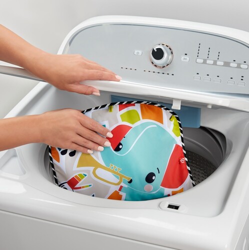 - Soft, machine-washable playmat features loops to attach toys