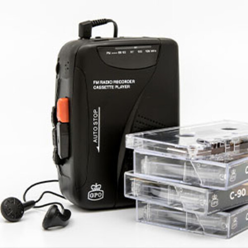 The portable cassette player was an iconic piece of kit for music fans in the 80s and 90s. Play tapes or use the FM radio and listen through your headphones.