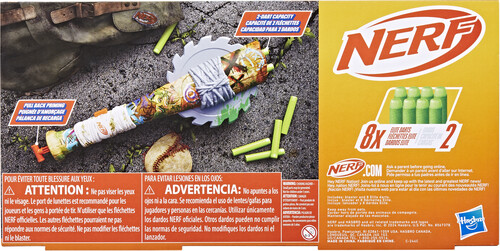 The Zombie Strikeout blaster is designed to look like a broken baseball bat with a circular foam saw blade attached to it. The handle automatically retracts when the dart fires. It includes 8 Nerf Elite darts. Featuring fun details from end to end, the Nerf Zombie Strikeout blaster is great for zombie fans and a perfect accessory for zombie parties, games, and events.