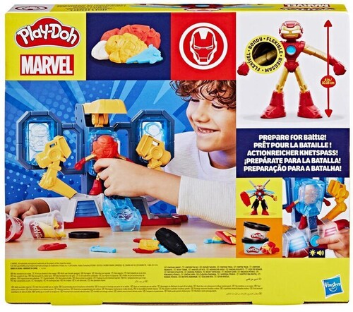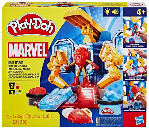 With this immersive kids playset, kids can choose 1 of 3 different armor molds to power up the Iron Man action figure. Plug the mold into the set and clamp it into place around the figure, load the chamber with Play-Doh compound, then press the lever to activate lights and sounds and mold armor right onto the figure!