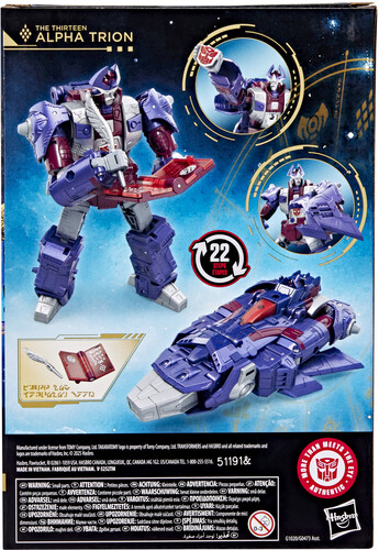 The 7-inch (17.5 cm) figure converts from robot action figure to Cybertronian hovercraft in 22 steps. With intricate poseability and attachable accessories like a covenant book, quill, and Autobot insignia, The Thirteen Alpha Trion action figure makes an awesome addition to any collection.