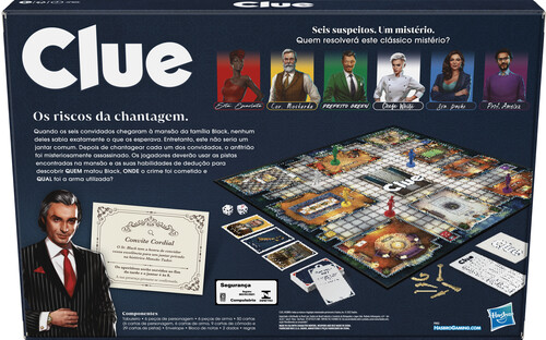 - Includes gameboard, 6 character tokens, 6 weapon tokens, 50 cards (6 character cards, 6 weapon cards, 9 room cards, and 29 Clue cards), solve envelope, notepad, 2 dice, and rules.