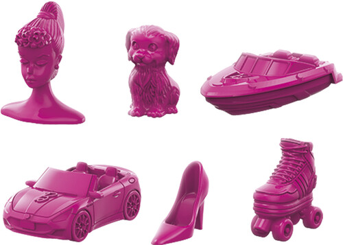 6 PINK ZINC TOKENS: Dream pink! Choose from 6 Barbie-inspired zinc tokens in her signature color: Dog, Shoe, Sportscar, Speedboat, Roller Skate, and Barbie herself