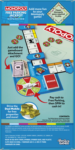 The Monopoly Free Parking Jackpot Expansion brings a fresh twist to the Monopoly game and takes half the time to play. Just attach this expansion to the classic Monopoly board, and turn the Free Parking space into a Jackpot. (Classic Monopoly game required to play. Sold separately.) Spin the spinner for a chance to win BIG money!