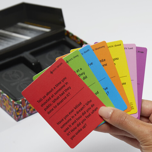 - HOW TO PLAY: Draw a card and ask someone one of the questions. If you get a good answer, award the card as a point. But the other player has a choice: Answer the question or take a sip. After all, some sins should stay hidden
