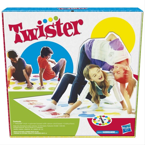It features classic Twister gameplay, plus 2 more fun moves: Spinner's Choice and Air. First, give the spinner a whirl and see what’s next as players try to keep their hands and feet on the mat. Right foot red! Left foot green! If a player's knee or elbow touches the mat, or they fall over, they're out. With Spinner's Choice, the Spinner gets to make up a move for the other player to do. If the spinner's arrow lands on Air, the player must put a hand or foot in the air, not on the mat. Be the last player standing to win!