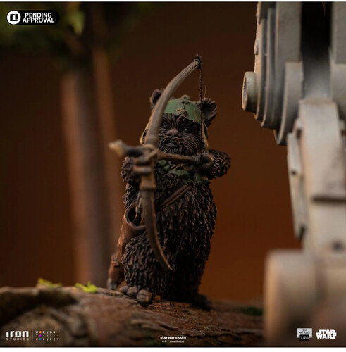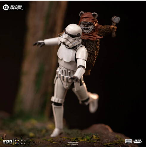 On a small moon in the Outer Rim, covered by dense forests, high mountains, and savannas, home to species like the small and furry tribal Ewoks, a Wookiee warrior volunteers for the team tasked with destroying the shield generator of the second Death Star, a moon-sized battle station built by the Galactic Empire as the successor to the first Death Star, and partially completed. On this mission, the charismatic giant furball, with the help of the local natives, manages to take control of a two-legged combat walker, the AT-ST, and use it in his mission against imperial troops guarding the generator. This iconic scene from the movie Star Wars: Episode VI – Return of the Jedi is meticulously recreated by Iron Studios in the statue “AT-ST and Chewbacca - Star Wars - Demi Art Scale 1/20”, featuring Chewie emerging from the hatch on top of the AT-ST, alongside the Ewoks battling a Stormtrooper and turning the tide of the battle in favor of the Rebel forces. On a forest diorama base of Endor, the statue also offers the option for the top hatch to be closed.