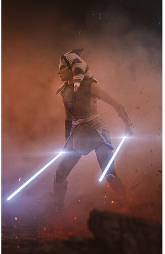 A warrior, trained by her master to be part of the Jedi legacy, heads into battle wielding two lightsabers. Surrounded by dust and smoke, numerous enemies fall before her combat skills.