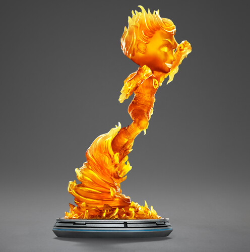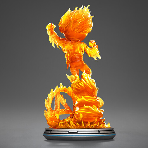 With clenched fists and a confident smirk, Johnny is surrounded by swirling fire effects that curl around his body and erupt from the base. His signature “4” still burns bright on his chest, grounding him as one-fourth of the iconic Fantastic Four team—even while he blazes his own trail in style.
