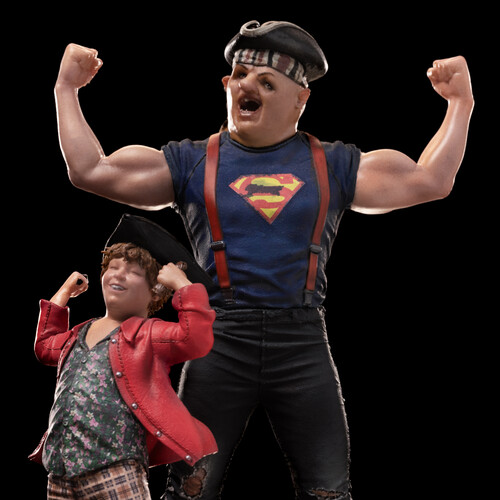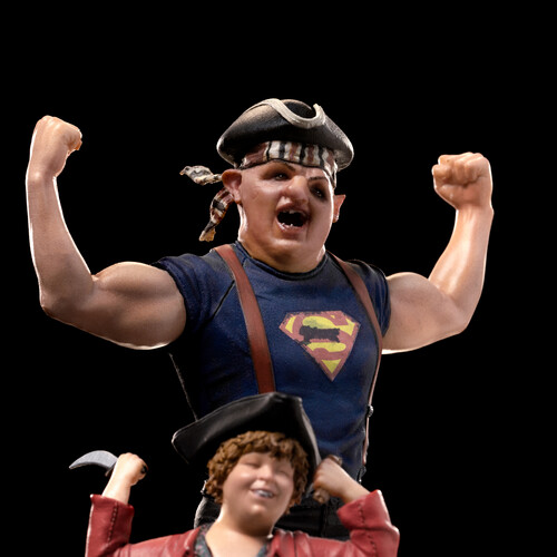 Chunk, the curly-haired, daring boy, wields a curved dagger while wearing a pirate hat, and Sloth, the gentle giant with a deformed face, shows off his muscular physique and the iconic “S” on his chest. Inspired by the classic 1980s cult film The Goonies, the Sloth and Chunk - The Goonies - Art Scale 1/10 statue captures the beloved duo atop a pedestal reminiscent of One-Eyed Willy’s pirate ship deck.