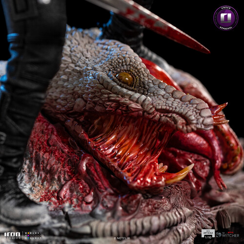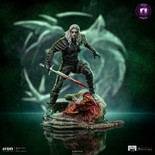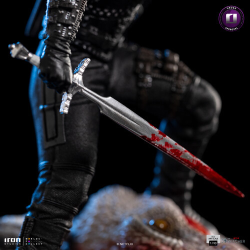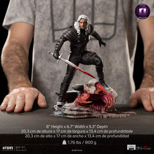 Protagonist of the novel “Wiedźmin” (The Witcher), from the Polish writer Andrzej Sapkowski, that acts as creative consultant of the show, the statue of Geralt of Rivia by Iron Studios brings an extra interchangeable head, and you can choose to display it with his characteristic red eyes, or with his black eyes under the effect of a potion that activate his abilities and powers as a witcher.