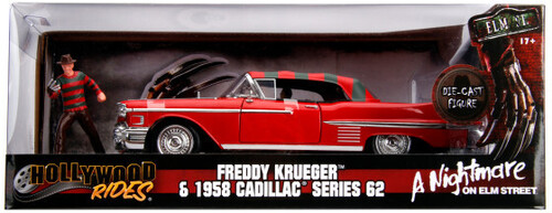One, Two, Freddy's coming for you. Straight from the nightmare itself, this 1958 Cadillac Series 62 takes styling cues directly from the haunter of your dreams and includes a 100% die cast 2.75" Freddy Krueger figure. Crafted from durable materials such as 100% die - cast metal and premium rubber tires. This beautifully sculpted die-cast collectible car is sure to standout in any Nightmare on Elm Street collection.