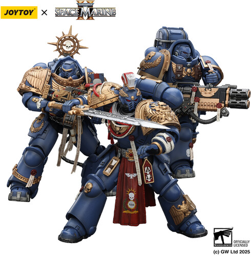 Each figure is meticulously detailed with the signature blue and gold of the Ultramarines, showcasing ornate relic armor, sacred weaponry, and full articulation — a tribute to the valor and precision of the Emperor’s finest.