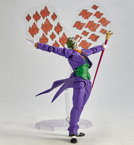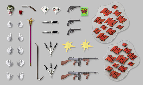 A wide range of poses are possible thanks to the ingenious movable mechanism created by Katsuhisa Yamaguchi. The vivid colors and deep wrinkled paint realistically express the Joker's madness. In addition to the conventional accessories, Ver. 1.5 adds many items that stimulate the Joker's mischievous spirit!
