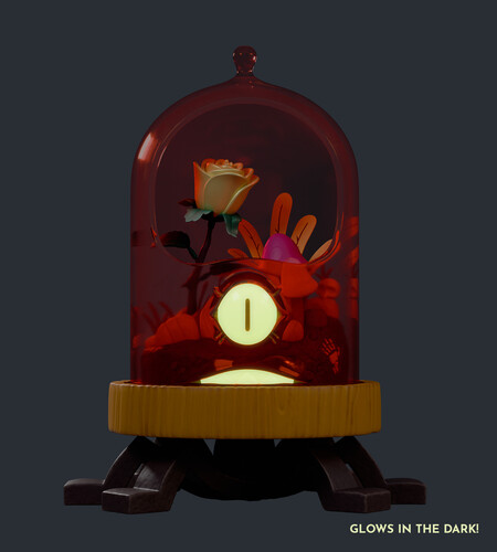 Picked for its wondrous colors, the rose at center of the terrarium quickly began to change the plants around it as mushrooms sprouted, strange fronds emerged, and even a skeleton or two could be seen. The poor family had no idea what was quietly growing on their shelf. Soon the eye opened and the family was never seen again.