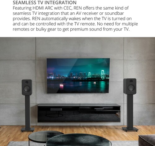 - SEAMLESS TV INTEGRATION - Equipped with HDMI ARC and CEC, REN integrates seamlessly with your TV, delivering superior sound quality without the necessity for a bulky receiver or multiple remotes. It also features auto-wake functionality and can be conveniently controlled via your TV remote.