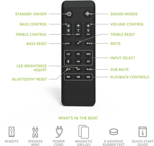 WHAT'S IN THE BOX: Remote Control, 2 x Magnetic Grilles, Power Cord, Speaker Wire, 8 x Rubber Feet, Quick Start Guide