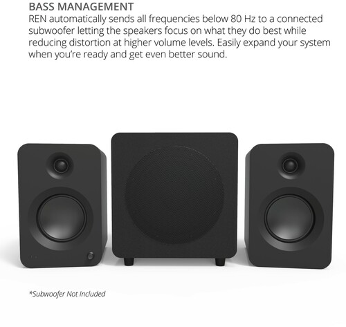 - SEAMLESS USBWOOFER INTEGRATION - When a subwoofer is connected to REN’s sub output, the system automatically redirects all frequencies below 80 Hz to the subwoofer. This allows the main speakers to concentrate on mid and high frequencies, minimizing distortion at higher volume levels.