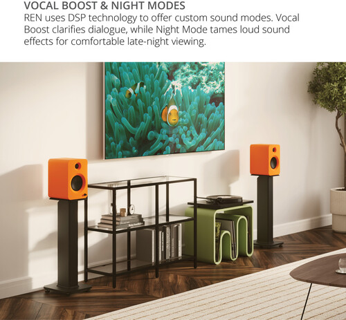 REN tackles the frustration of quiet dialogue and overwhelming sound effects with two sound modes that boost vocals and reduce low frequencies for nighttime viewing. When it’s time to add a subwoofer, REN automatically filters sub-bass from its 5.25” aluminum woofers, letting them focus on midrange frequencies with minimal distortion.