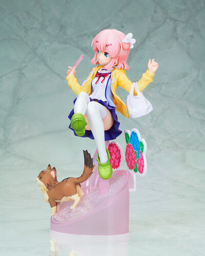 The figure recreates the scene shown in the illustration and anime opening, where Momo walks in the rain with Shamiko. Features like her softly fluttering hair, her usual jacket worn over her uniform, and casual shoes have been carefully sculpted down to every last detail, complete with the ice pop that she exchanged vows with gripped in her right hand. Be sure to notice the The Demon Girl Next Door motifs designed on the base, as well as Metako with his adorable expression looking this way.