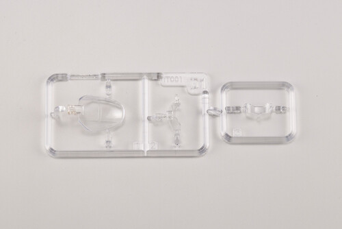 - The model’s main color scheme is light blue and light gray, with a gunmetal core and clear and clear green for the canopy and visor. The kit also includes sticker decals to recreate the design from the illustration.