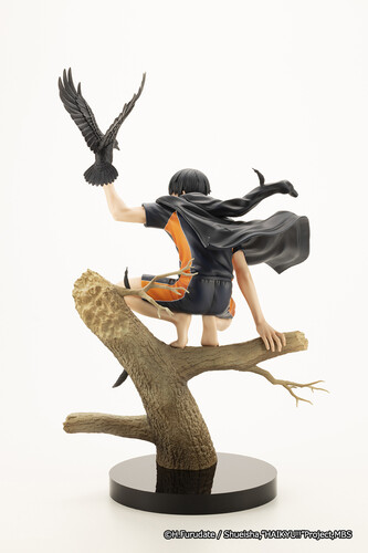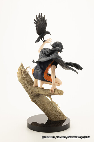Careful attention was paid to sculpting even the finest of details, such as the wrinkles in his clothes and the muscle definition on his arms and legs. With his jacket fluttering in the wind, the movement in his fingers, and the crow perfectly captured in the moment it looks to take flight, this piece meticulously recreates the delicate, yet light atmosphere of the original visual.
