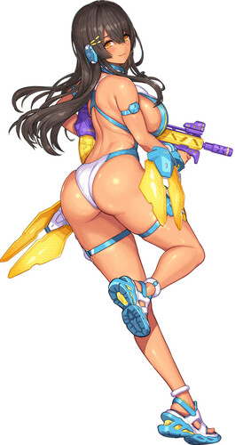 The traditionally Japanese-styled mecha parts that adorn Asra Archer have been vastly changed in favor of various clear parts that bring out the refreshing atmosphere of an everlasting summer. Pay close attention to the many alluring features in this piece, such as the tight fit of the mecha parts that accentuate her tanned, glamorous body, and the way her competitive swimsuit presses down on her skin.