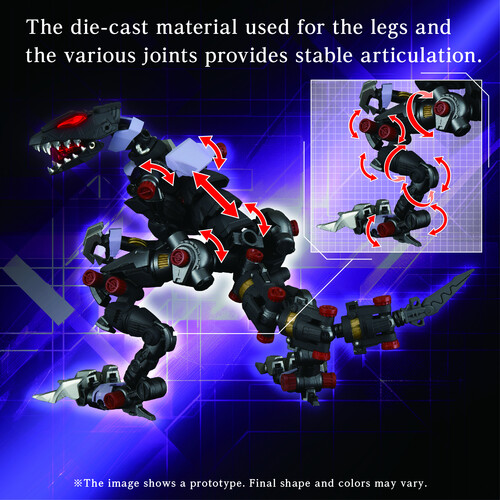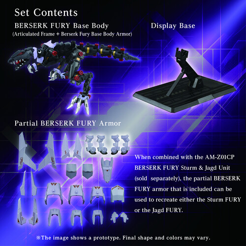 This product includes some of the Berserk Fury armor required when combining it with the Berserk Fury (base unit) and the “AM-Z01CP Berserk Fury Sturm & Jagd Unit” (sold separately). It also comes with a display stand for showcasing the main unit. Features LED light-up effects for the character's signature eyes and charged particle cannon. Multiple leg joints and a swing mechanism allow for dynamic posing. The inclusion of a Zoid Core strategically placed die-cast parts prioritizing functionality, and detailed painting contribute to its high quality as a display model.