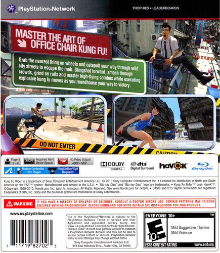It's a high-speed getaway — and you're the one on the run. You may be the detective, but the mob is after you, and you have no time to hesitate, no time to think — and no time to get off of your chair. The chase is on, and your getaway vehicle is your trusty chair. As you catapult through the twisted, untamed streets of a mayhem-filled megalopolis, crowds clog your way, rogue pedestrians pick fights and the mob follows close at your backrest. You are low on options, but you feel a wave of strength and power overcome you as you roundhouse kick, karate chop and combo attack obstacles out of your way. You're fighting for your life now — can you Kung Fu your way to safety? The heart-pumping, frantic thrill of the chase is real when you control all of the wheeling and fighting action from your PlayStation Move in Kung Fu Rider. Whip the PlayStation Move around, unleash an arsenal of martial arts attacks and try to stay in control during the dizzying ride as you transport yourself into the crazy world of a detective on the run. Whether you face the mob alone or pair up with a Kung Fu-fighting friend, get ready to move with all of your might — just because you're in a chair doesn't mean you can relax.
