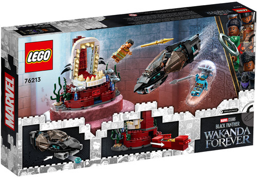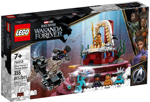 - Marvel characters – Includes Shuri, Attuma and King Namor minifigures. The buildable submarine and throne room also includes seaweed and fish accessories