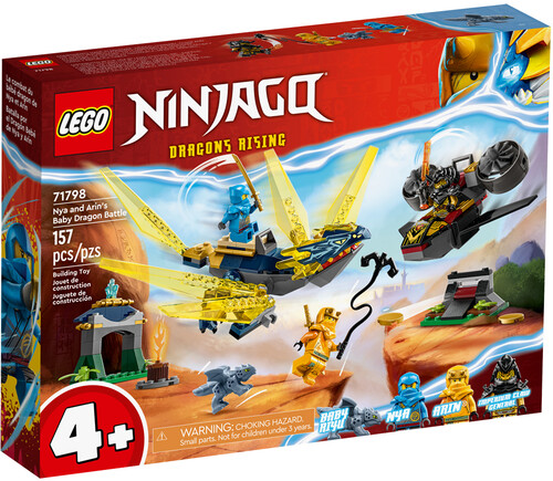 - Beginner LEGO® set – Kids aged 4+ can recreate scenes from the NINJAGO® Dragons Rising TV series as they learn to build with the Nya and Arin’s Baby Dragon Battle (71798) playset