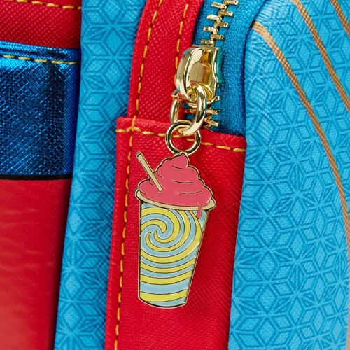 Dare to dream big! Superhero heights are within reach with this Loungefly Marvel Ms. Marvel Cosplay Mini Backpack. Carry this accessory when your day packs a punch. This dazzling mini backpack replicates Ms. Marvel’s iconic suit, complete with a golden lightning bolt with bold red stripes, which come to life in applique detail. Even Ms. Marvel’s applique and debossed red scarf drapes heroically between sheens of metallic blue. Gold embroidered and metallic applique flourishes save the day with a touch of sparkle. Blue and red details carry over to the side pockets, and an enamel zipper charm of a frozen treat serves as a reminder that even heroes need a reward after fighting crime, fitting in at school, and keeping up family expectations. It’s the perfect accessory for carrying your daily necessities—or for stretching your everyday travels into crime-fighting adventures.