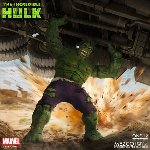 Armed with a collection of powerful FX accessories, Hulk can recreate his most iconic moves: a thunderous clap that sends shockwaves through the battlefield, a midair leap powered by a dynamic jump base, and an INCREDIBLE One:12 Collective ground shattering Impact-Base with movable, floating debris.