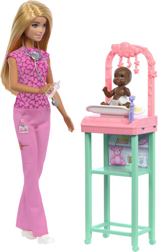 - This set includes Barbie and her adorable baby doll patient with doctor career-themed play pieces!
