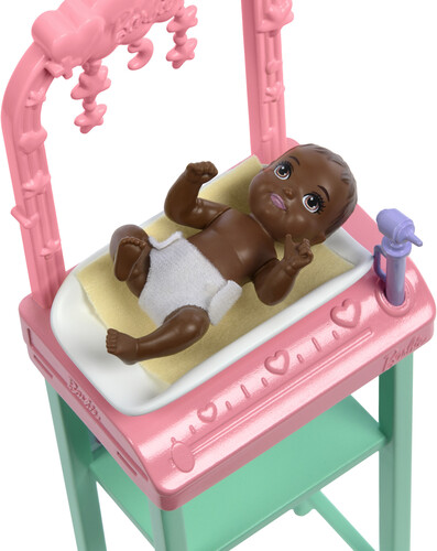 This set includes a baby doctor environment including Barbie and her adorable baby doll patient! Barbie is wearing her pink heart print scrub set, ready to keep babies happy and healthy! The set also includes her examination table with Stars overhead and a shelf underneath to hold all the accessories, like a baby bottle or Barbie's stethoscope.