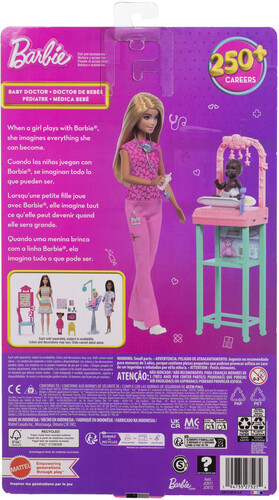 Includes 1 Barbie® doll wearing a pink heart print top, pink pants, shoes, 1 baby with diaper, 1 stethoscope, 1 otoscope, 1 baby bottle, 1 examination table with an overhead mobile.
