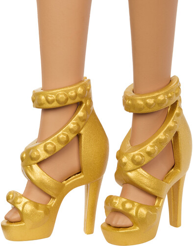 With gold, strappy dance heels, the fashion doll is ready to perform with her sparkly red, ruffled hem dress and gold drop earrings. Her topknot styled hair completes her champion look. Including her trophy accessory, let imaginations take center stage and win big!