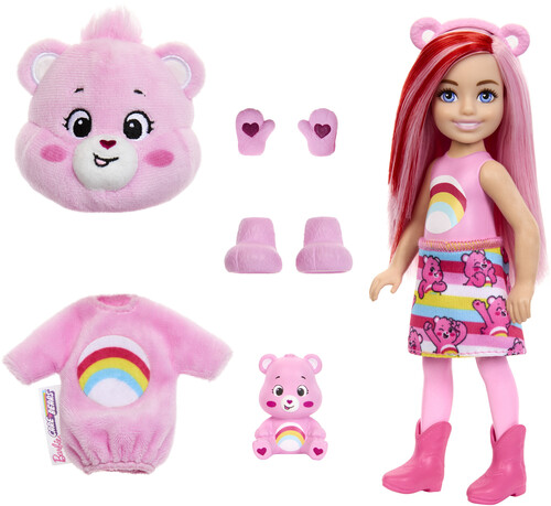 Includes Chelsea small doll wearing Care Bears costume (5-piece set) and 3 bags containing mini pet, 1 pair of shoes, 1 headband and 1 skirt.