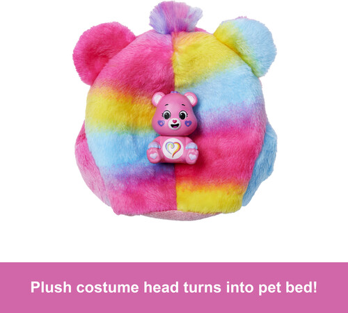 Discover one of three different Care Bears characters in the line's second series -Togetherness Bear, Dream Bright Bear or Good Vibes Bear. Remove the adorable plush costume to reveal a posable Barbie doll. Which doll will you reveal Then find more surprises like a skirt, headband, earrings, a pair of boots or shoes, sponge-comb and matching mini Care Bear! Reverse the plush top for a fleece jacket and flip the costume head for a pet bed. Use water for even more cuteness with repeat color-change transformation on the doll's face! Kids will love discovering -and collecting -all the cute surprises in this lovable series.
