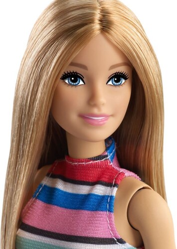 - Barbie® doll wears a versatile dress with a colorfully striped bodice and denim skirt paired with white shoes.