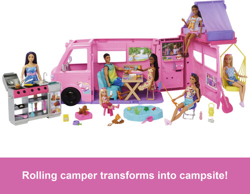 - Head to the great outdoors with the Barbie Dream Camper playset, featuring 7 play areas and 60+ accessories, including a puppy, to inspire endless camping stories!