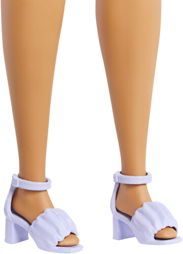 - Barbie doll has a curvy body type and wavy dark brown hair! Half-frame sunglasses add a sleek touch to her cute and colorful outfit.