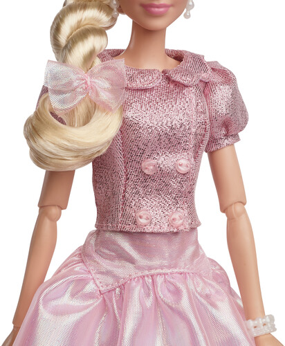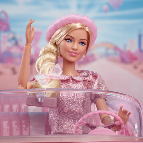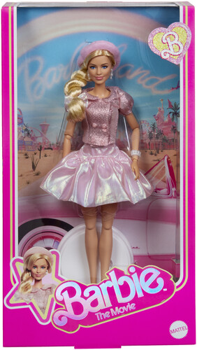 - Take home a part of Barbie The Movie with this collector Barbie doll! Modeled after Margot Robbie’s character, Barbie wears a matching shimmery pink outfit when she leaves Barbie Land in the film.