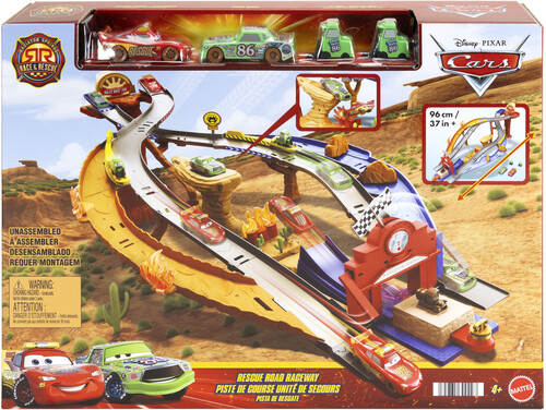 Includes 1 Disney and Pixar Cars Radiator Springs Race & Rescue Rescue Road Raceway Playset with Lightning McQueen and Chick Hicks cars plus 2 Pitty character vehicles.