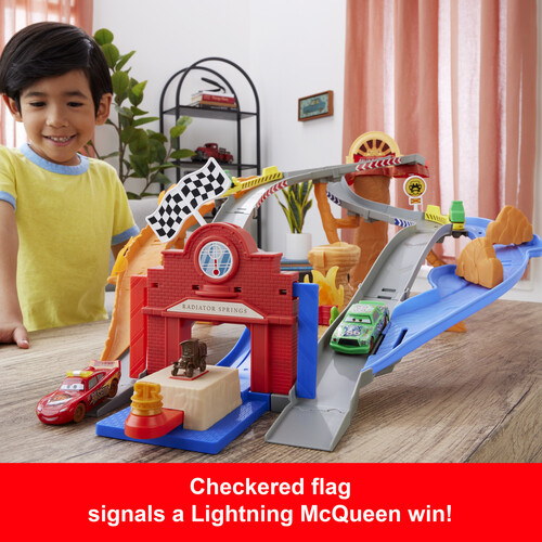 - Lightning McQueen faces off against Chick Hicks and his Pitties in the Disney and Pixar Cars Radiator Springs Race & Rescue Rescue Road Raceway playset.