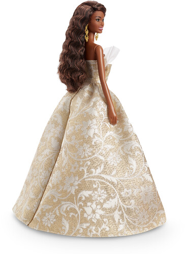 She’s dressed for festive revelry in a voluminous gown with a silver and golden brocade pattern – an homage to holiday décor. The dress is packed with glamorous details, including a dramatic tulle-accented neckline and an oversized bow, complemented by cascading golden earrings and matching mules. In packaging that’s ideal for display, this doll is a perfect addition to collections or holiday wish lists.