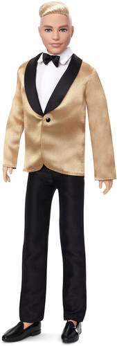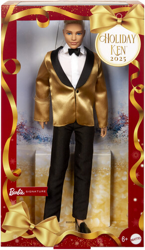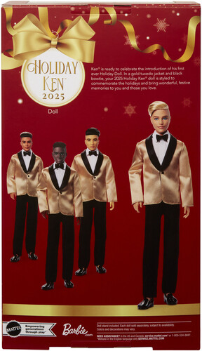 In his premiere appearance for the beloved holiday collection, Ken looks debonair in a luxe golden satin shawl collar tuxedo jacket, black pants, black loafers, and a bowtie to round out the outfit. Designed to complement the golden tones in Holiday Barbie doll’s glittering gown, he’s a perfect addition to the annual tradition – and a must-have for collectors looking for a little extra cheer this holiday season.