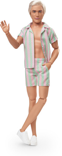 Inspired by Ken's character in Barbie™ The Movie, this Ken® doll wears a beachy, striped matching set. With a surfboard in tow, he's having the best day ever in Barbie Land!