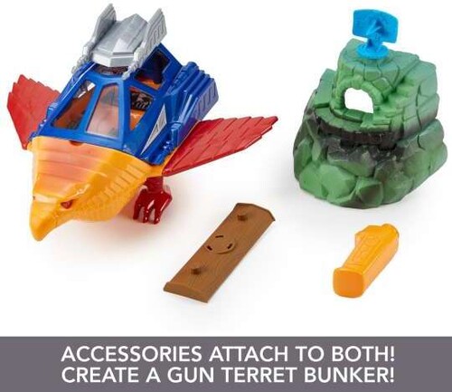 Includes 1 Masters of the Universe™ Origins Talon Fighter vehicle, 2-piece Point Dread outpost accessory, 1 swappable radar dish accessory, 1 swappable cannon, 2 vehicle feet and 1 wood-style connector platform. Colors and decorations may vary.