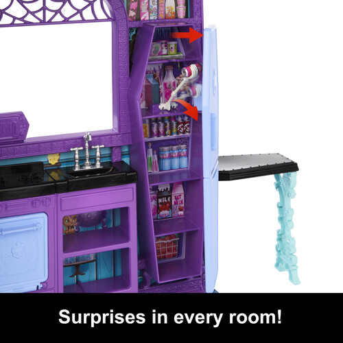 - Uncover the surprises one by one! Open the kitchen fridge for a skeleton hand pop-out, and the toilet lid for a funny monster reveal!
